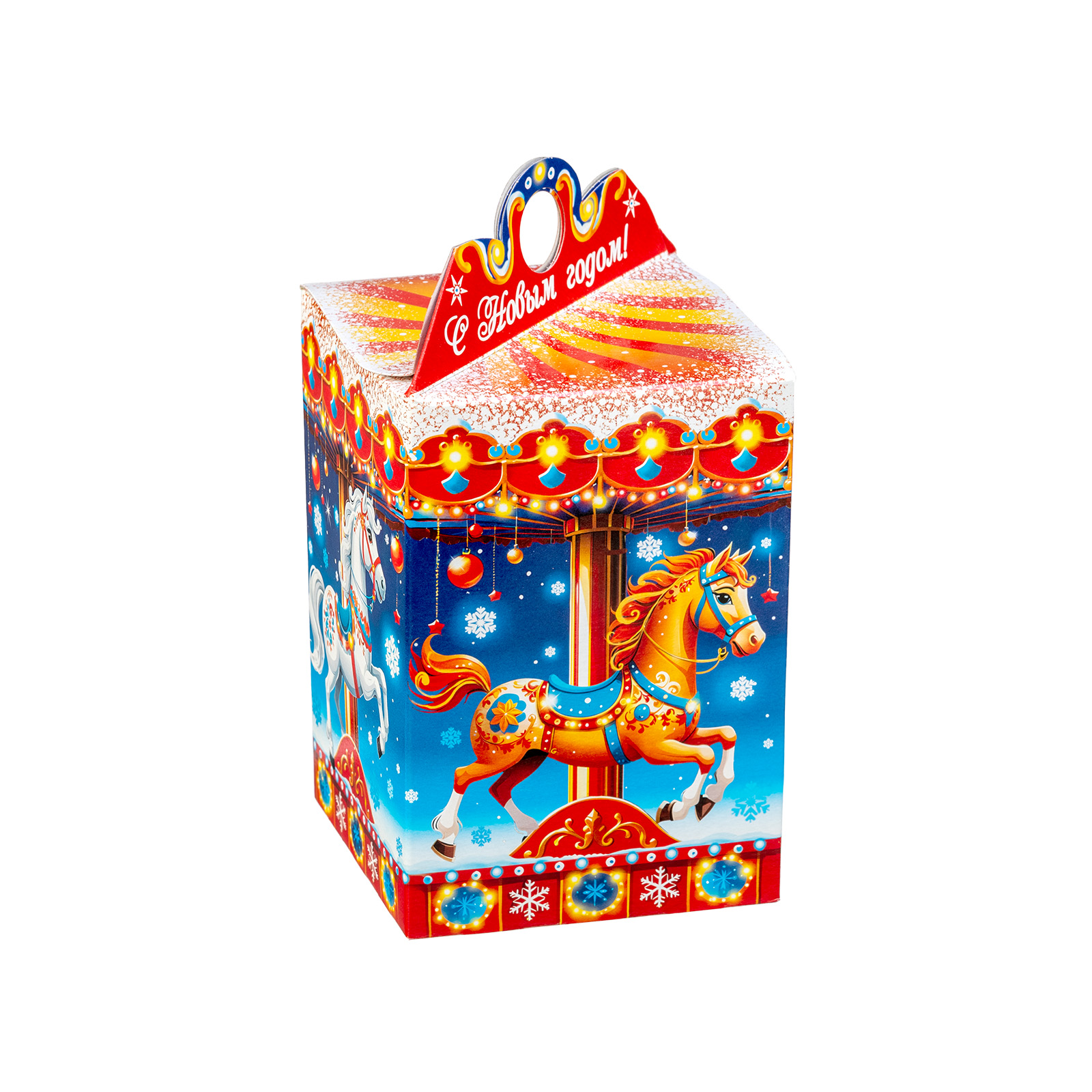 Прекрасный новогодний сладкий подарок, который поднимет настроение сластене абсолютно любого возраста. Это небольшая картонная коробочка в форме фонарика, украшенная одной большой яркой композицией. С каждой стороны нарисованы грациозные лошадки, прям как на той самой карусели из парка аттракционов! Сверху и снизу упаковки тянутся контрастные линии, украшенные новогодними символами, а на крышке есть небольшая удобная ручка и поздравительная надпись. Такой подарок будет к месту как на детском празднике, так и на корпоративе - каждый найдет в этом наборе для себя что-то приятное и теплое.