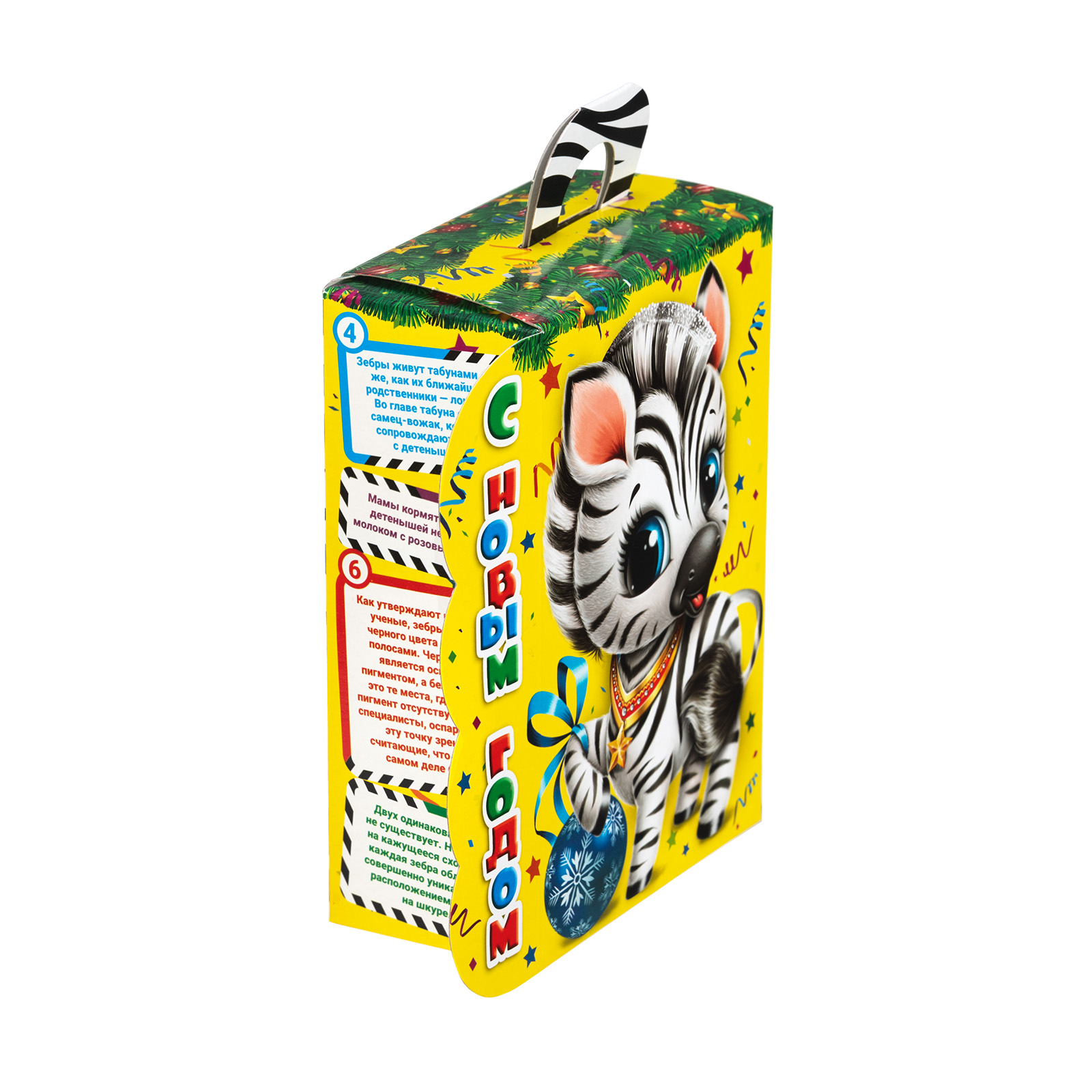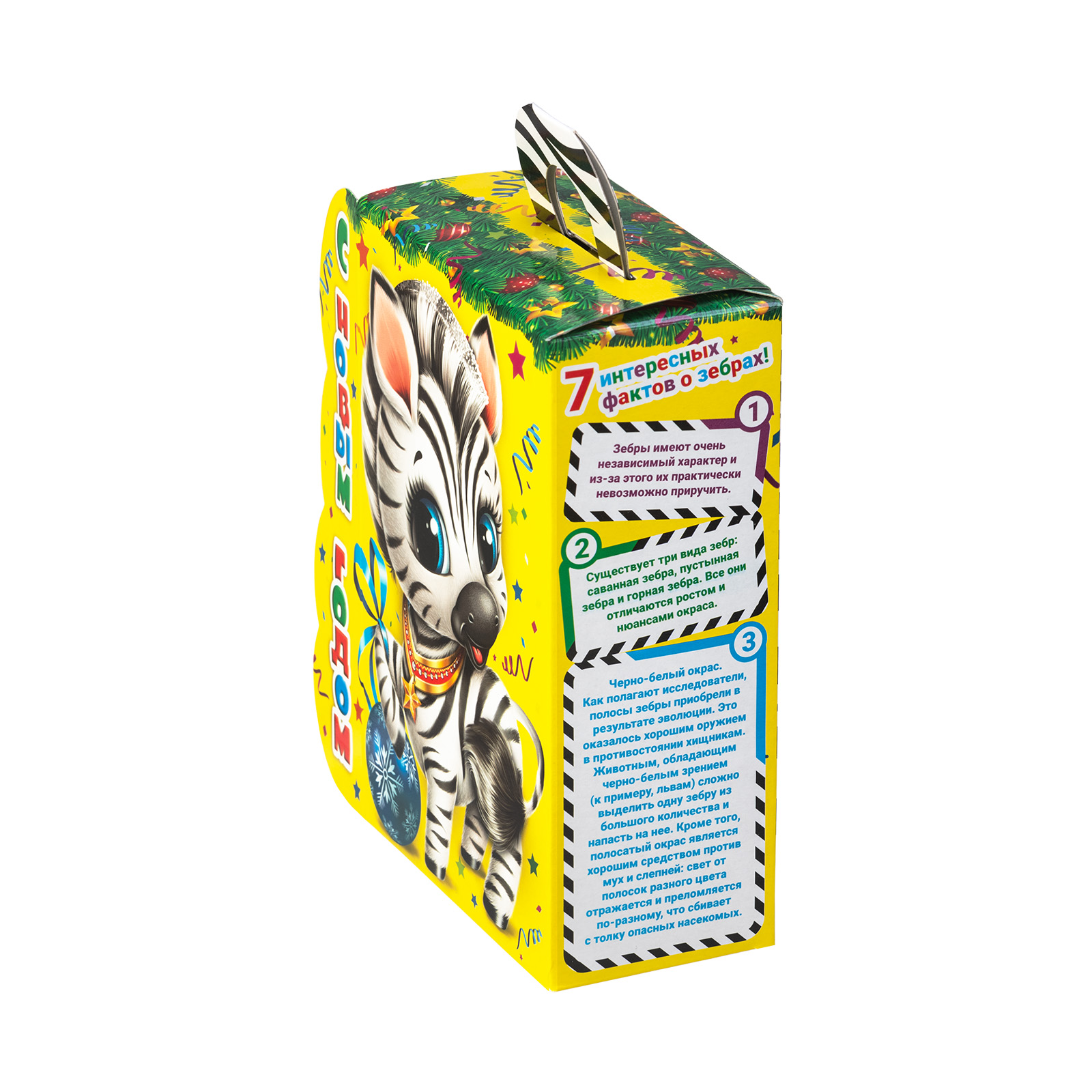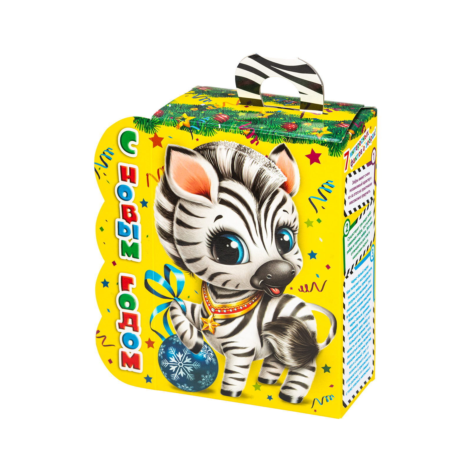 Ищете новогодний сладкий подарок в школу или детский сад? Присмотритесь к набору “Полосатый талисман”! Несмотря на небольшие размеры, этот подарок способен подарить безграничную радость тому, кто его получит. Сладости упакованы в маленькую ярко-желтую коробочку с изображением очаровательной крошки-зебры, которая приветливо улыбается и будто приглашает нас к новогоднему столу. Сверху находится небольшая черно-белая ручка,а сбоку коробочки можно найти статью с интересными фактами о зебрах. В состав подарка входит 700 грамм самых разнообразных отборных сладостей, которые скрасят любое семейное чаепитие и помогут наполнить дом позитивом и добром!