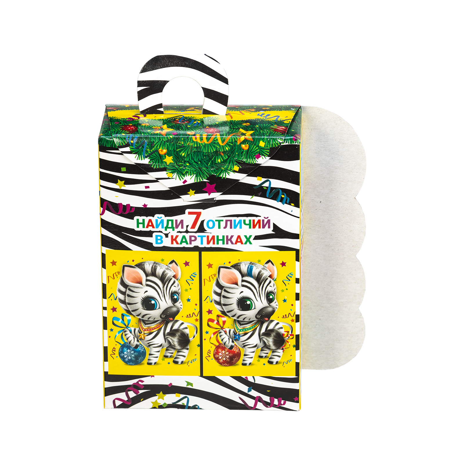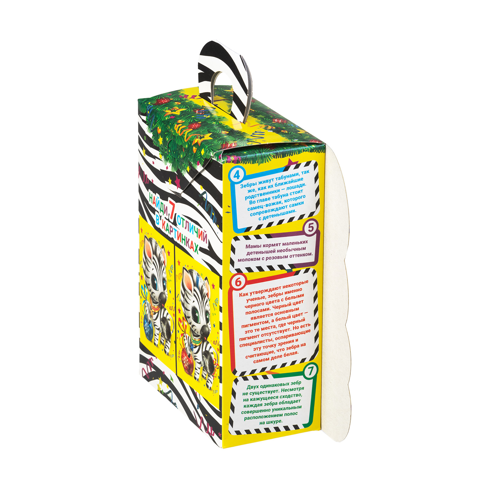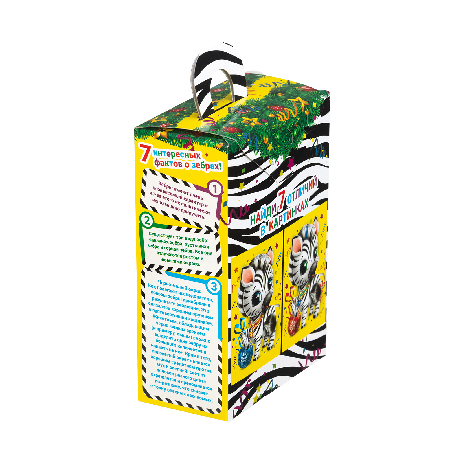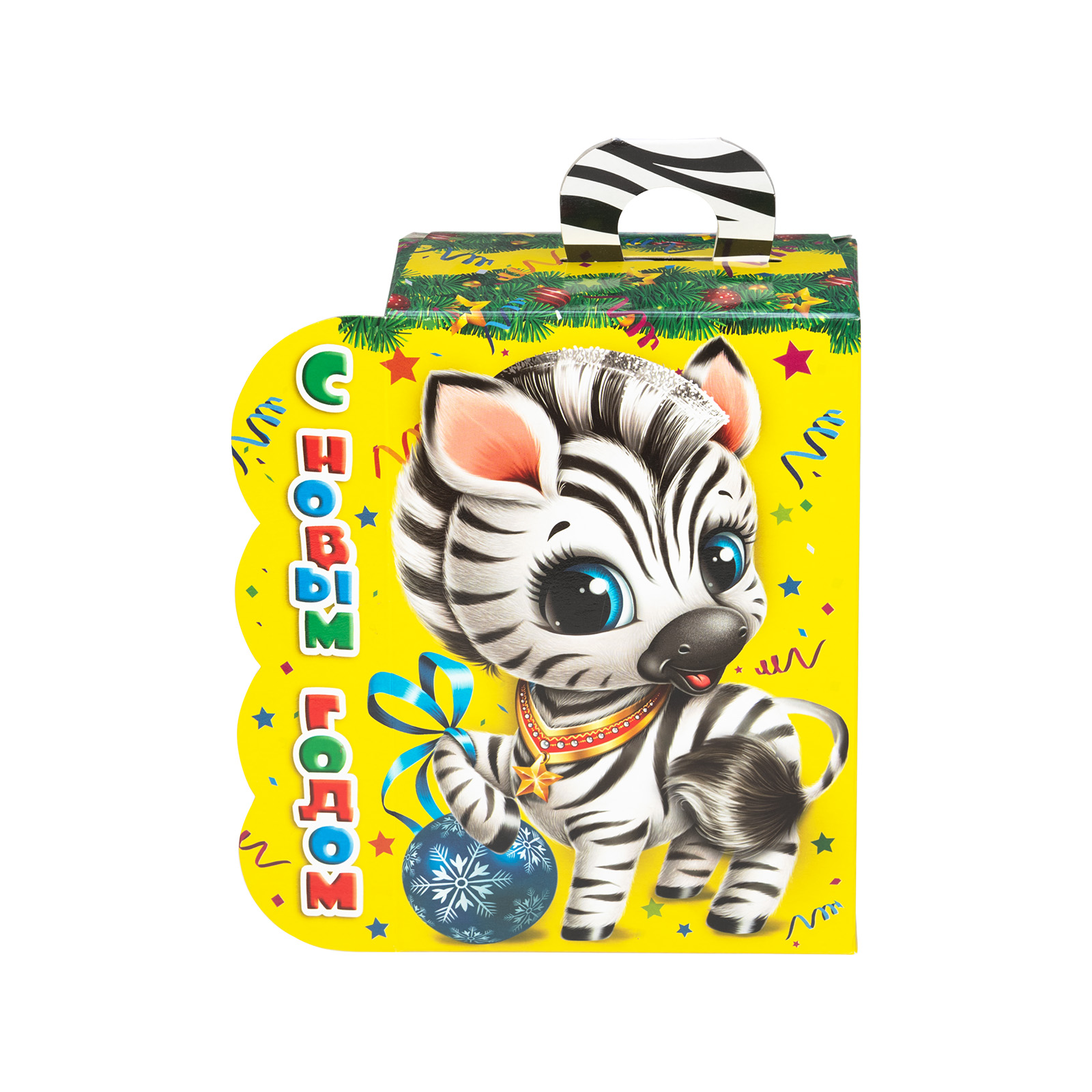 Ищете новогодний сладкий подарок в школу или детский сад? Присмотритесь к набору “Полосатый талисман”! Несмотря на небольшие размеры, этот подарок способен подарить безграничную радость тому, кто его получит. Сладости упакованы в маленькую ярко-желтую коробочку с изображением очаровательной крошки-зебры, которая приветливо улыбается и будто приглашает нас к новогоднему столу. Сверху находится небольшая черно-белая ручка,а сбоку коробочки можно найти статью с интересными фактами о зебрах. В состав подарка входит 700 грамм самых разнообразных отборных сладостей, которые скрасят любое семейное чаепитие и помогут наполнить дом позитивом и добром!