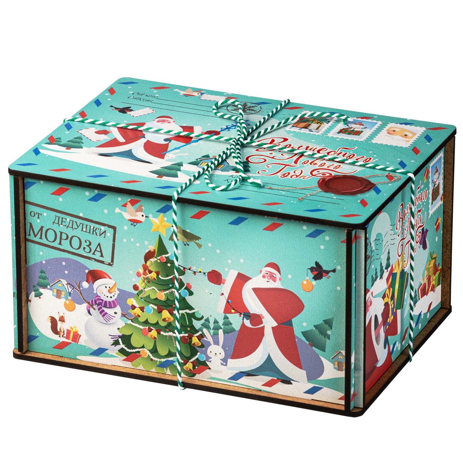 Подробнее о доставкеЯркий красочный подарок в деревянном коробе «Посылка Бирюзовая» непременно понравится вам и вашему ребенку. Цветовая гамма цвет морской воды. На рисунке Дед Мороз. По контуру декоры с почтовой символикой. На строках надписи от кого и для кого. Размер упаковки 18*10*13 сантиметров. За счет универсального сюжета на упаковке данный подарок можно подарить как ребенку, так и взрослому. Сладкий набор весом 1500 граммов непременно порадует ваших любимых сладкоежек.Подарок имеет сертификат качества, с которым вы можете ознакомиться на нашем сайте. Этот и другие варианты посылок смотрите в разделе дерево.